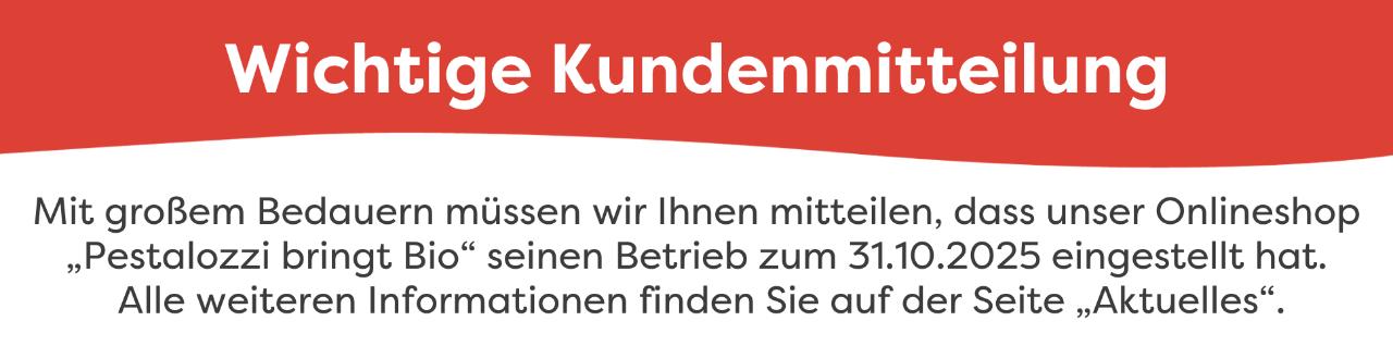 Mit großem Bedauern müssen wir Ihnen mitteilen, dass unser Lieferservice „Pestalozzi bringt Bio“ seinen Betrieb zum 31.10.2025 eingestellt hat.